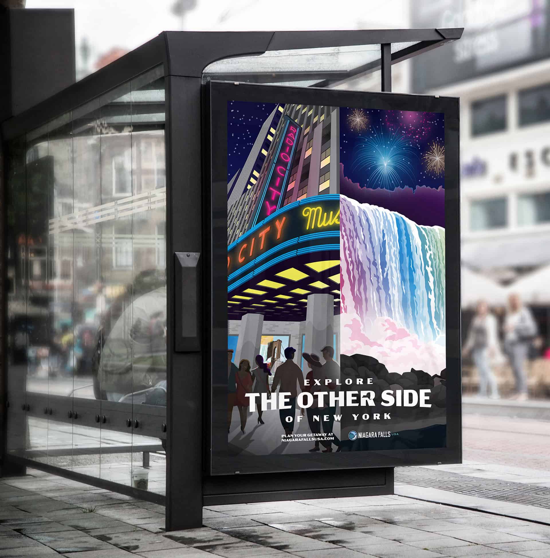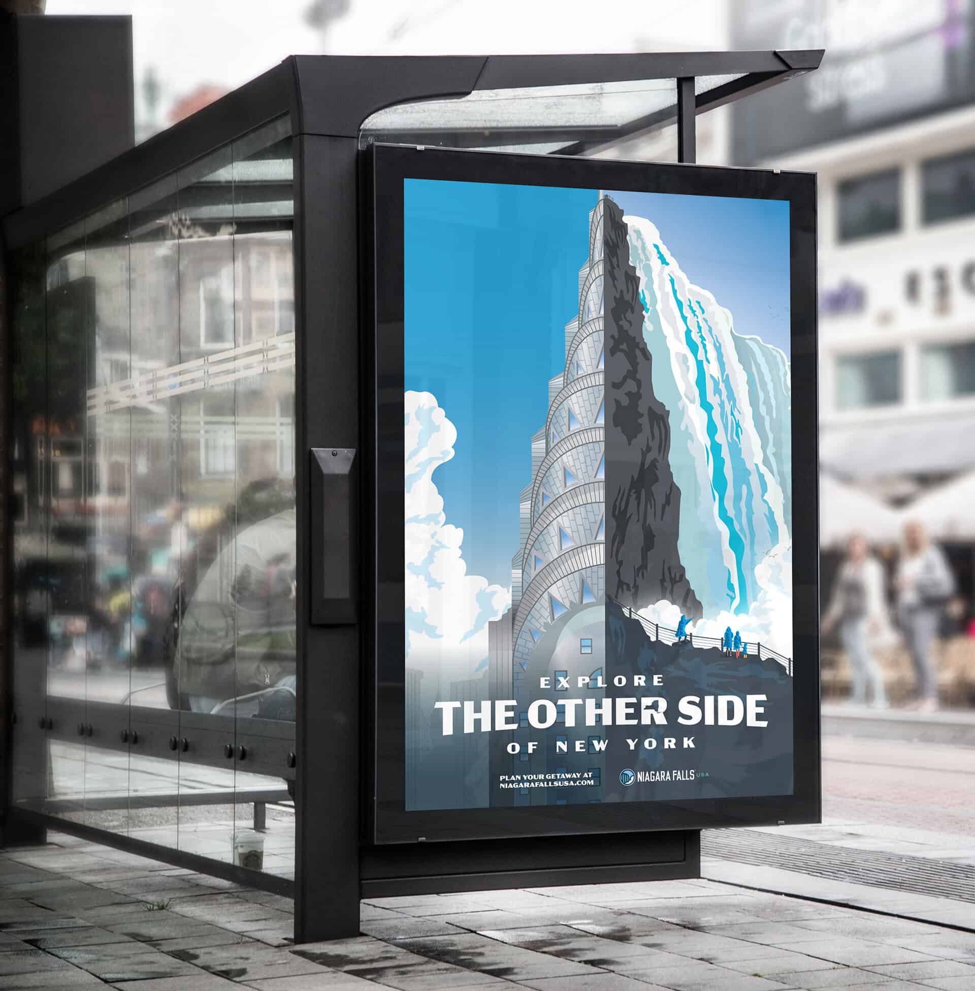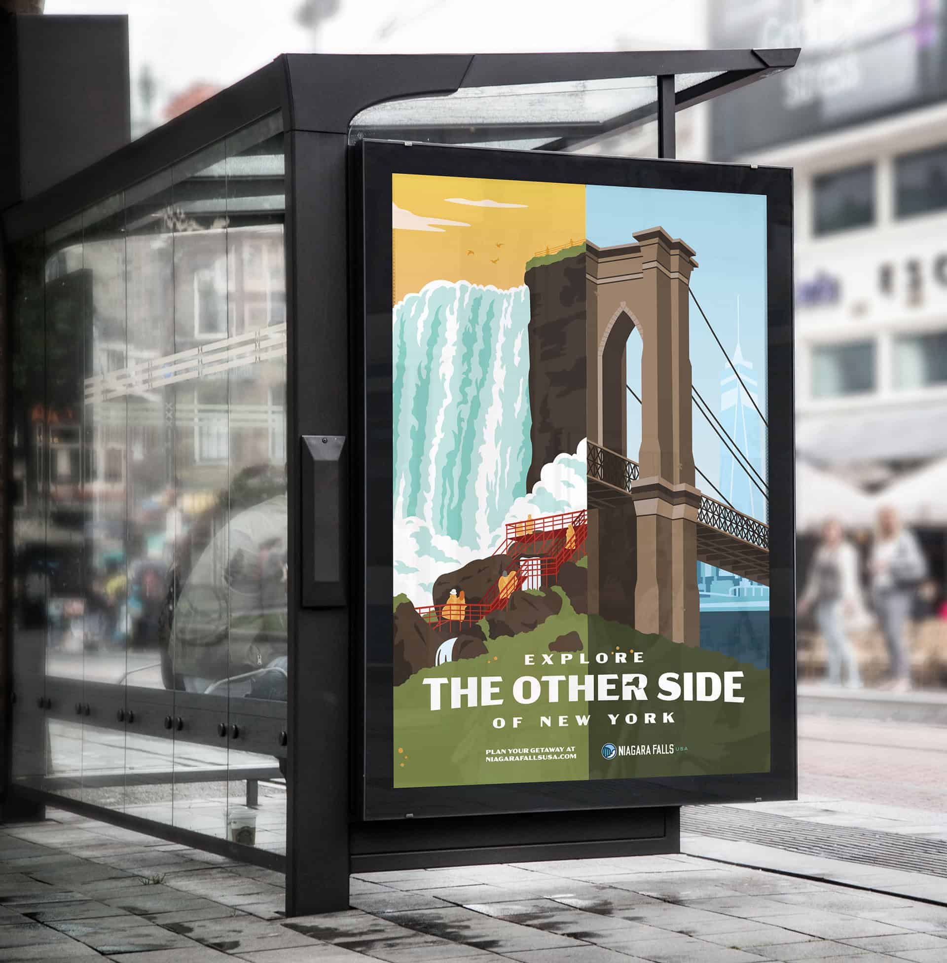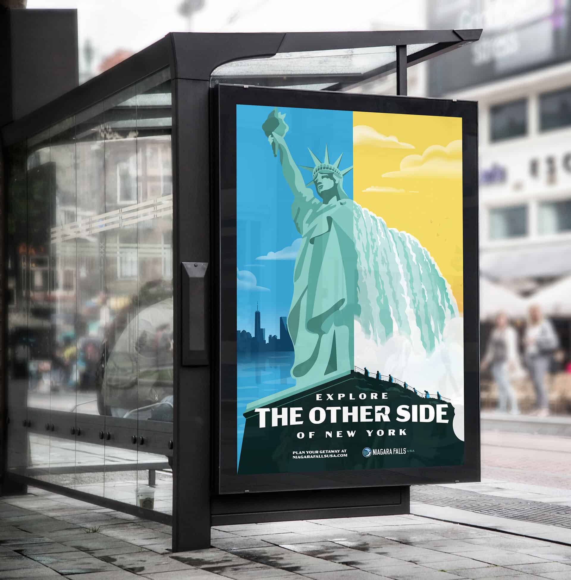 When travelers think of New York, the images that come to mind for many are of New York City: The Statue of Liberty, the Empire State Building, the Brooklyn Bridge. Not the natural world wonder on the other side of the state—Niagara Falls. To capitalize on that association, we introduced NYC visitors to a spectacular destination just a one-hour flight away through a series of bold, colorful images juxtaposing iconic New York City landmarks with the cascading waters of Niagara Falls.